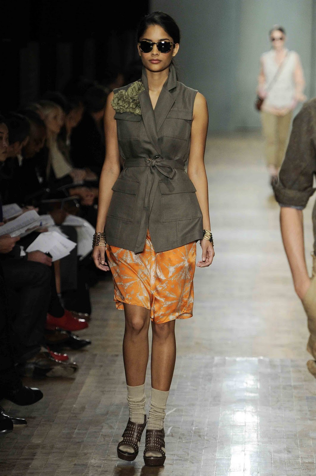 The subtle washes of color crest and break into a series of oceanic hues from watery blue to slate grays, where authentic textures pervade. Slub cotton leggings are topped off with a denim military blazer and boxy parachute blouses fit with trim tulip skirts, creating a clever sense of whimsy. Menswear echoes this lighthearted exchange as chambray oxfords loosen up patch‐pocket safari jackets while streamlined exteriors in salty gray hues add polish to heather sweatshirts.